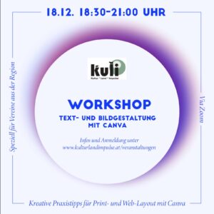 Am Mittwoch, 18. Dezember, von 18.30 bis 21 Uhr, veranstalten wir einen kostenlosen Workshop per Zoom für all jene, die ihre/n Verein/e durch einen professionellen Auftritt boosten möchten. Expertin Verena Schrattenecker gibt eine Einführung in das open-software-tool CANVA, das zur Erstellung von Einladungen, Flyern, Postern, etc. verwendet werden kann und beantwortet eure individuellen Fragen dazu.