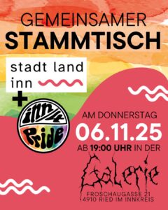 Next get together will take place thursday, nov. 6th, at bar galerie in ried (Froschaugasse), at 7 pm. The get together will be a joint event with the queer community of Innpride.